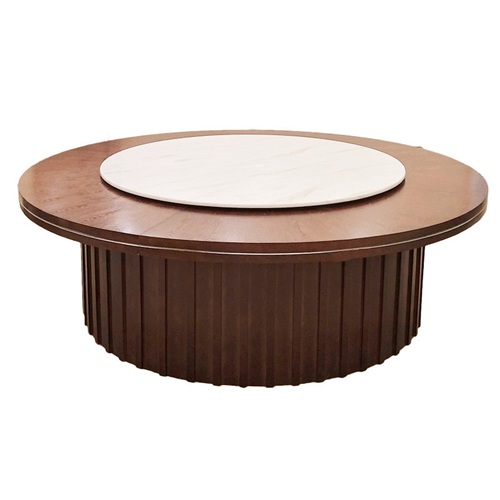 ,最大的特点是在围板上采用圆弧形设计,别具一格,转盘面为大理石制作,整体框架使用了进口橡胶木制作,木材经过3到烘干工艺,含水率控制在8%-10%,确保多年使用以后不开裂,无裂纹,并且内置盘式机芯,经久耐用无任何噪音,让电动餐桌功能更加丰富,就餐者有更好的就餐体验。