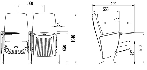 2.座椅基本中心距为560±5mm,座包打开侧深780±5mm,写字板打开侧深825±5mm,基本椅高为1040±5mm,最小排距:900mm。通过相关家具产品质量检验中心QB/T2602-2013《影剧院公共座椅》的相关检测依据,甲醛释放量≤0.120mg/m³h;抗引燃特性符合GB 17927.1-2011中的要求。